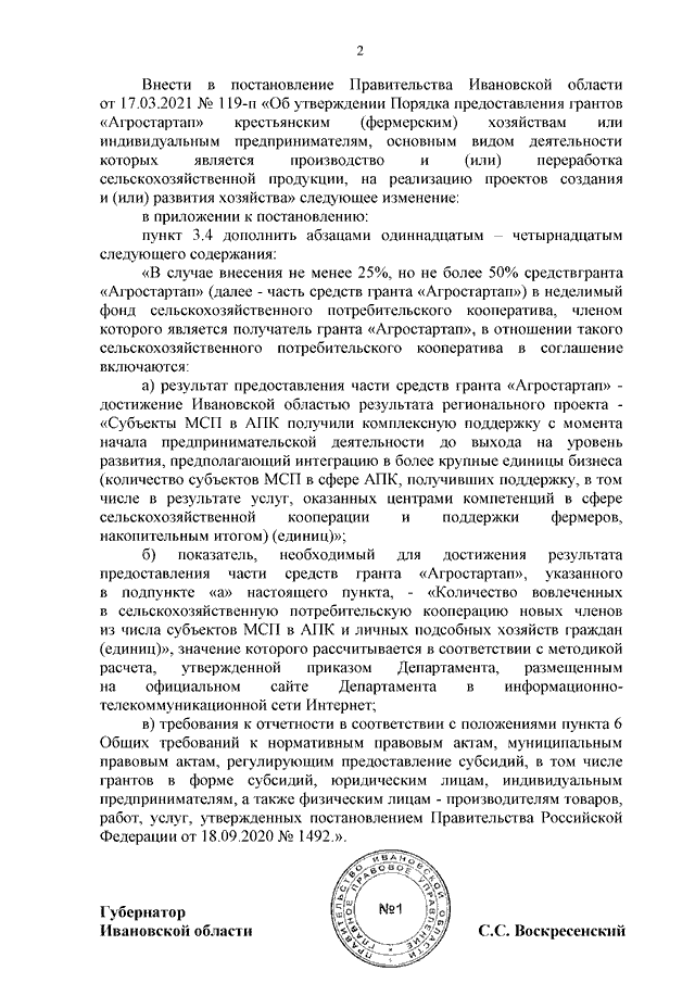 Постановление Правительства Ивановской области от 20.10.2021 N 497-п "О внесении изменения в постановление Правительства Ивановской области от 17.03.2021 N 119-п "Об утверждении Порядка предоставления грантов "Агростартап" крестьянским (фермерским) хозяйствам или индивидуальным предпринимателям, основным видом деятельности которых является производство и (или) переработка сельскохозяйственной продукции, на реализацию проектов создания и (или) развития хозяйства"