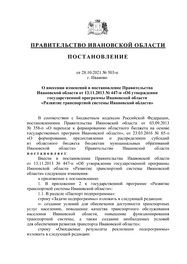 Постановление Правительства Ивановской области от 28.10.2021 N 503-п "О внесении изменений в постановление Правительства Ивановской области от 13.11.2013 N 447-п "Об утверждении государственной программы Ивановской области "Развитие транспортной системы Ивановской области" (вместе с "Порядком предоставления и распределения субсидий из областного бюджета бюджетам муниципальных образований Ивановской области на организацию транспортного обслуживания населения в границах муниципального образования городским наземным электрическим транспортом")