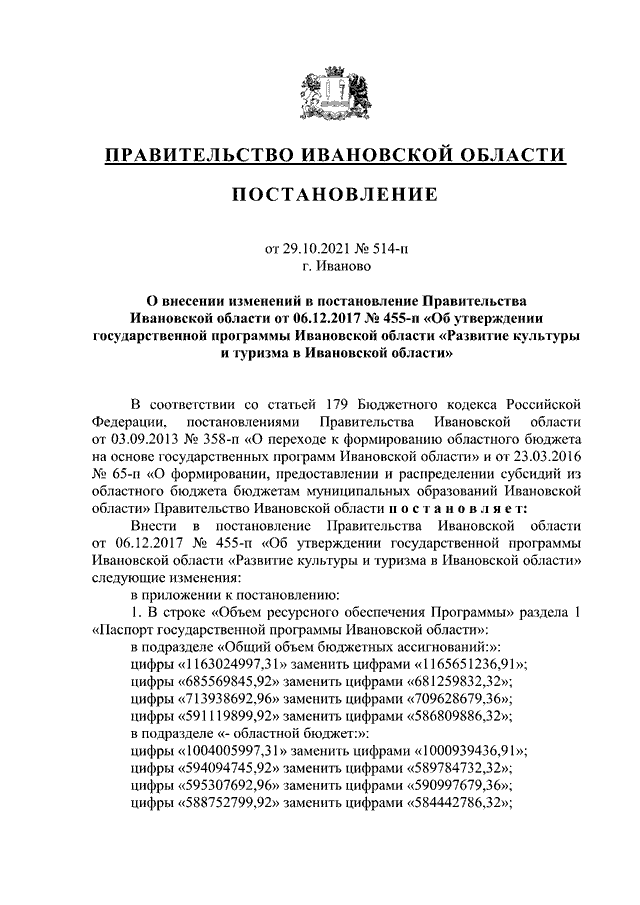 Постановление Правительства Ивановской области от 29.10.2021 N 514-п "О внесении изменений в постановление Правительства Ивановской области от 06.12.2017 N 455-п "Об утверждении государственной программы Ивановской области "Развитие культуры и туризма в Ивановской области" (вместе с "Порядком предоставления и распределения субсидий бюджетам муниципальных образований Ивановской области на реализацию мероприятий по модернизации библиотек в части комплектования книжных фондов библиотек муниципальных образований")