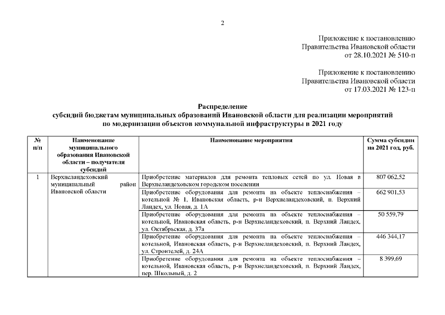 Постановление Правительства Ивановской области от 28.10.2021 N 510-п "О внесении изменения в постановление Правительства Ивановской области от 17.03.2021 N 123-п "О распределении субсидий бюджетам муниципальных образований Ивановской области для реализации мероприятий по модернизации объектов коммунальной инфраструктуры в 2021 году"