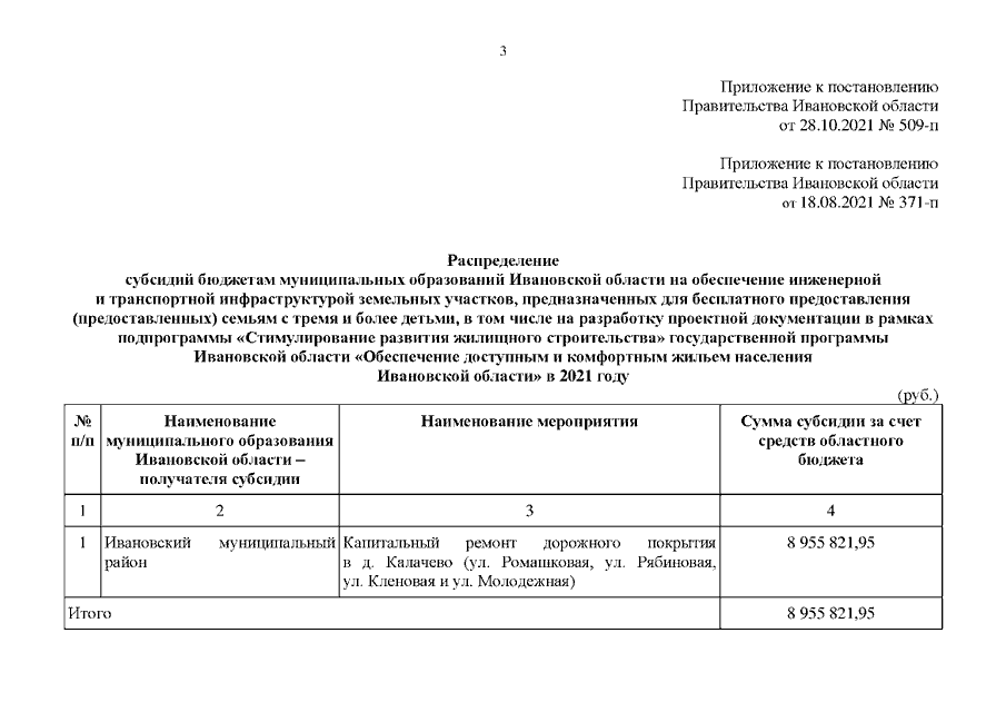 Постановление Правительства Ивановской области от 28.10.2021 N 509-п "О внесении изменения в постановление Правительства Ивановской области от 18.08.2021 N 371-п "О распределении субсидий бюджетам муниципальных образований Ивановской области на обеспечение инженерной и транспортной инфраструктурой земельных участков, предназначенных для бесплатного предоставления (предоставленных) семьям с тремя и более детьми, в том числе на разработку проектной документации в рамках подпрограммы "Стимулирование развития жилищного строительства" государственной программы Ивановской области "Обеспечение доступным и комфортным жильем населения Ивановской области" в 2021 году"