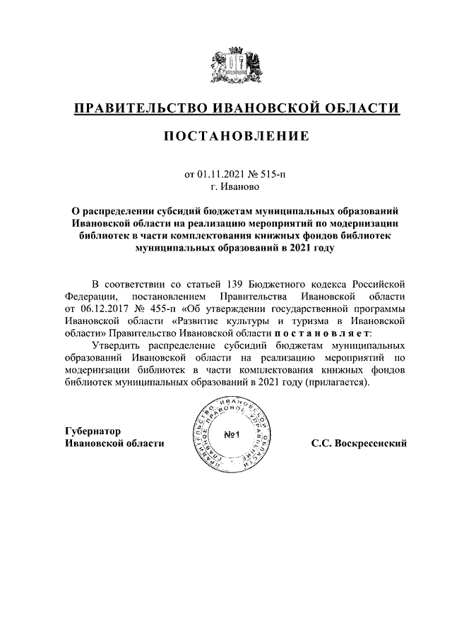 Постановление Правительства Ивановской области от 01.11.2021 N 515-п "О распределении субсидий бюджетам муниципальных образований Ивановской области на реализацию мероприятий по модернизации библиотек в части комплектования книжных фондов библиотек муниципальных образований в 2021 году"