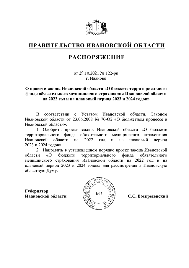 Распоряжение Правительства Ивановской области от 29.10.2021 N 122-рп "О проекте закона Ивановской области "О бюджете территориального фонда обязательного медицинского страхования Ивановской области на 2022 год и на плановый период 2023 и 2024 годов"