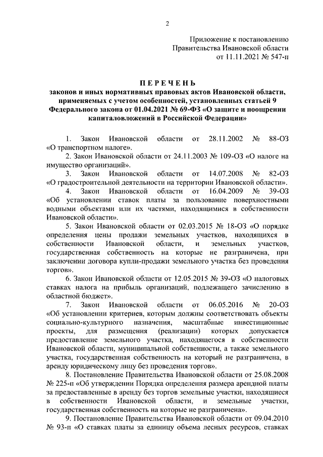 Постановление Правительства Ивановской области от 11.11.2021 N 547-п "Об утверждении перечня законов и иных нормативных правовых актов Ивановской области, применяемых с учетом особенностей, установленных статьей 9 Федерального закона от 01.04.2021 N 69-ФЗ "О защите и поощрении капиталовложений в Российской Федерации"