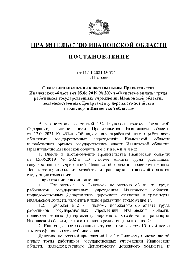 Постановление Правительства Ивановской области от 11.11.2021 N 524-п "О внесении изменений в постановление Правительства Ивановской области от 05.06.2019 N 202-п "О системе оплаты труда работников государственных учреждений Ивановской области, подведомственных Департаменту дорожного хозяйства и транспорта Ивановской области"