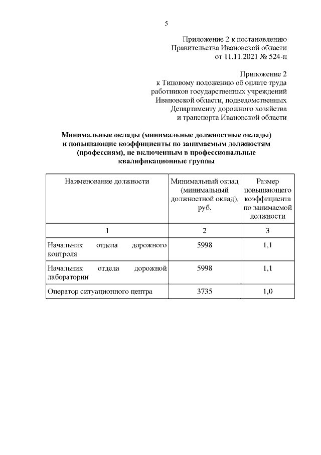 Постановление Правительства Ивановской области от 11.11.2021 N 524-п "О внесении изменений в постановление Правительства Ивановской области от 05.06.2019 N 202-п "О системе оплаты труда работников государственных учреждений Ивановской области, подведомственных Департаменту дорожного хозяйства и транспорта Ивановской области"