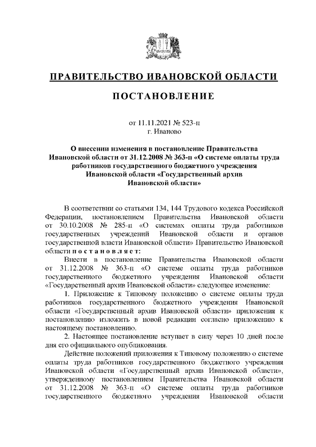 Постановление Правительства Ивановской области от 11.11.2021 N 523-п "О внесении изменения в постановление Правительства Ивановской области от 31.12.2008 N 363-п "О системе оплаты труда работников государственного бюджетного учреждения Ивановской области "Государственный архив Ивановской области"