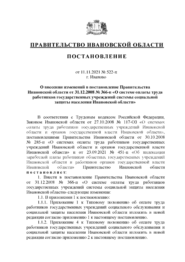 Постановление Правительства Ивановской области от 11.11.2021 N 522-п "О внесении изменений в постановление Правительства Ивановской области от 31.12.2008 N 366-п "О системе оплаты труда работников государственных учреждений системы социальной защиты населения Ивановской области" (вместе с "Перечнем профессиональных квалификационных групп должностей работников государственных учреждений системы социальной защиты населения Ивановской области", "Перечнем профессиональных квалификационных групп должностей работников государственных образовательных учреждений для детей-сирот и детей, оставшихся без попечения родителей, Ивановской области")