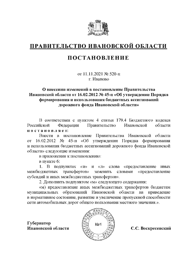 Постановление Правительства Ивановской области от 11.11.2021 N 520-п "О внесении изменений в постановление Правительства Ивановской области от 16.02.2012 N 45-п "Об утверждении Порядка формирования и использования бюджетных ассигнований дорожного фонда Ивановской области"