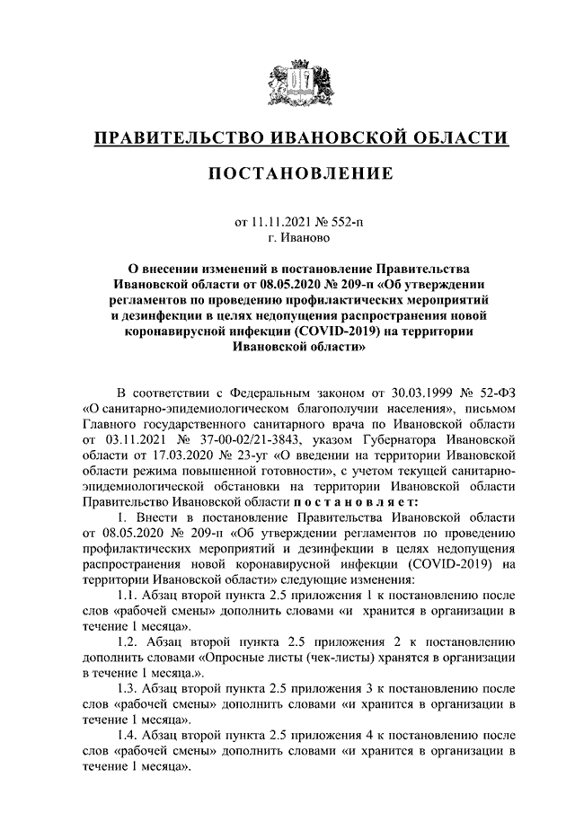 Постановление Правительства Ивановской области от 11.11.2021 N 552-п "О внесении изменений в постановление Правительства Ивановской области от 08.05.2020 N 209-п "Об утверждении регламентов по проведению профилактических мероприятий и дезинфекции в целях недопущения распространения новой коронавирусной инфекции (COVID-2019) на территории Ивановской области"