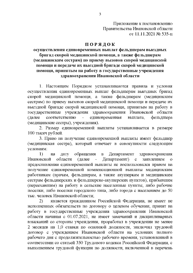 Постановление Правительства Ивановской области от 11.11.2021 N 535-п "Об осуществлении единовременных выплат фельдшерам выездных бригад скорой медицинской помощи, а также фельдшерам (медицинским сестрам) по приему вызовов скорой медицинской помощи и передаче их выездной бригаде скорой медицинской помощи, принятым на работу в государственные учреждения здравоохранения Ивановской области" (вместе с "Порядком осуществления единовременных выплат фельдшерам выездных бригад скорой медицинской помощи, а также фельдшерам (медицинским сестрам) по приему вызовов скорой медицинской помощи и передаче их выездной бригаде скорой медицинской помощи, принятым на работу в государственные учреждения здравоохранения Ивановской области")