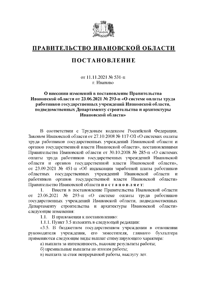 Постановление Правительства Ивановской области от 11.11.2021 N 531-п "О внесении изменений в постановление Правительства Ивановской области от 23.06.2021 N 293-п "О системе оплаты труда работников государственных учреждений Ивановской области, подведомственных Департаменту строительства и архитектуры Ивановской области"