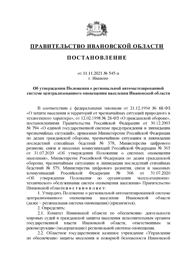 Постановление Правительства Ивановской области от 11.11.2021 N 545-п "Об утверждении Положения о региональной автоматизированной системе централизованного оповещения населения Ивановской области"