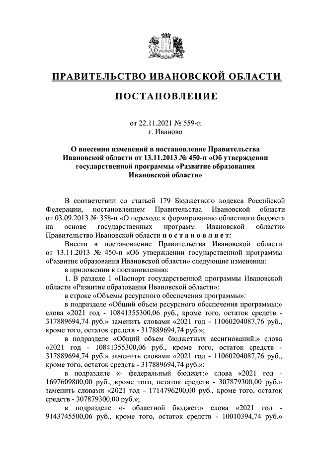 Постановление Правительства Ивановской области от 22.11.2021 N 559-п "О внесении изменений в постановление Правительства Ивановской области от 13.11.2013 N 450-п "Об утверждении государственной программы "Развитие образования Ивановской области"