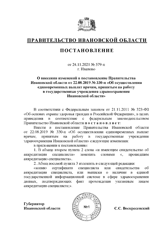 Постановление Правительства Ивановской области от 24.11.2021 N 579-п "О внесении изменений в постановление Правительства Ивановской области от 22.08.2019 N 330-п "Об осуществлении единовременных выплат врачам, принятым на работу в государственные учреждения здравоохранения Ивановской области"