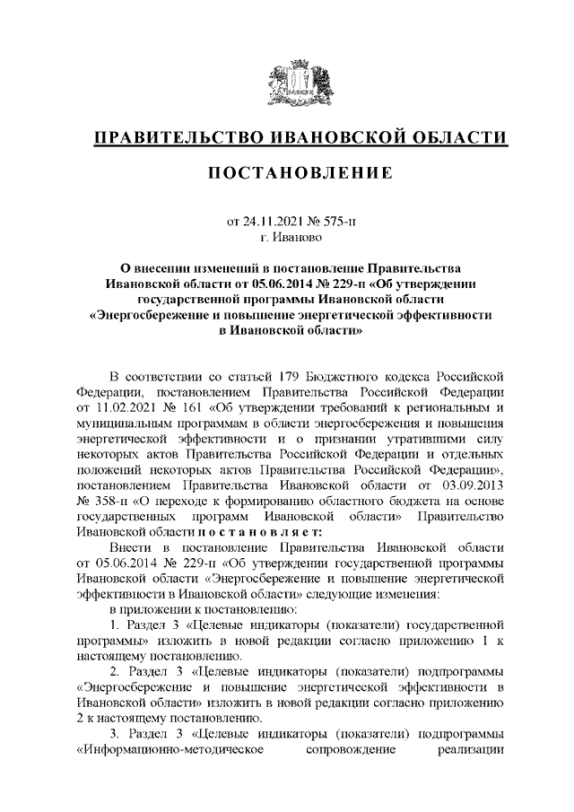 Постановление Правительства Ивановской области от 24.11.2021 N 575-п "О внесении изменений в постановление Правительства Ивановской области от 05.06.2014 N 229-п "Об утверждении государственной программы Ивановской области "Энергосбережение и повышение энергетической эффективности в Ивановской области"
