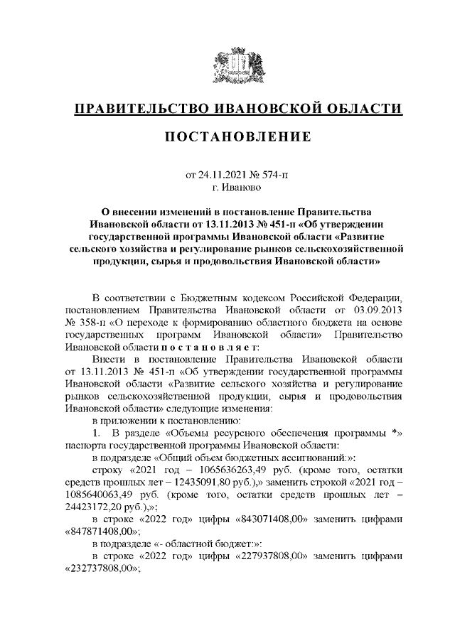 Постановление Правительства Ивановской области от 24.11.2021 N 574-п "О внесении изменений в постановление Правительства Ивановской области от 13.11.2013 N 451-п "Об утверждении государственной программы Ивановской области "Развитие сельского хозяйства и регулирование рынков сельскохозяйственной продукции, сырья и продовольствия Ивановской области"
