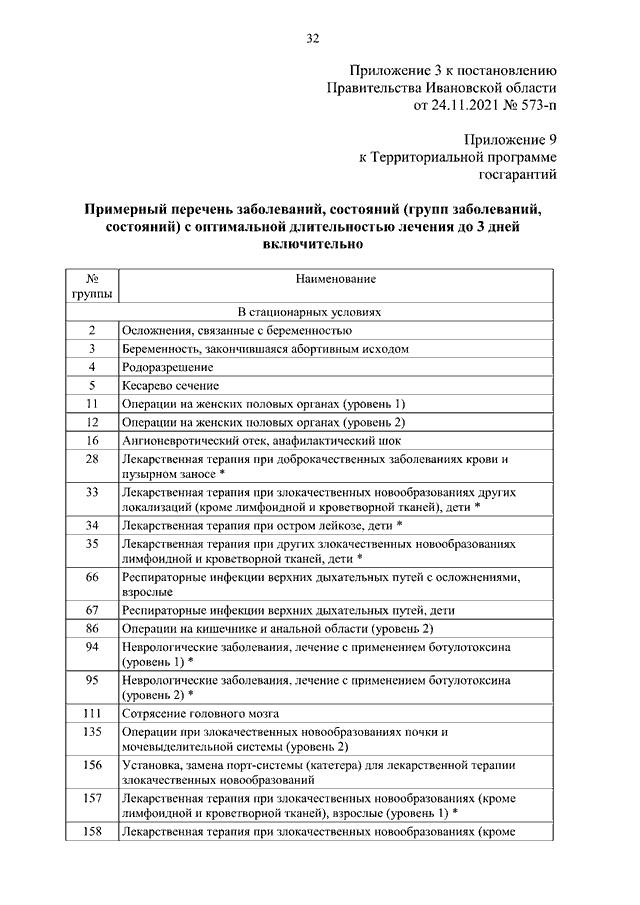 Постановление Правительства Ивановской области от 24.11.2021 N 573-п "О внесении изменений в постановление Правительства Ивановской области от 20.02.2021 N 96-п "Об утверждении Территориальной программы государственных гарантий бесплатного оказания гражданам медицинской помощи на территории Ивановской области на 2021 год и на плановый период 2022 и 2023 годов" (вместе с "Примерным перечнем заболеваний, состояний (групп заболеваний, состояний) с оптимальной длительностью лечения до 3 дней включительно")