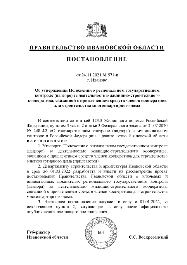 Постановление Правительства Ивановской области от 24.11.2021 N 571-п "Об утверждении Положения о региональном государственном контроле (надзоре) за деятельностью жилищно-строительного кооператива, связанной с привлечением средств членов кооператива для строительства многоквартирного дома"