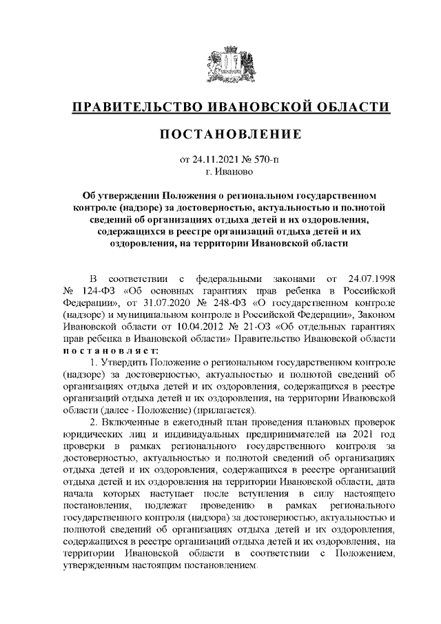 Постановление Правительства Ивановской области от 24.11.2021 N 570-п "Об утверждении Положения о региональном государственном контроле (надзоре) за достоверностью, актуальностью и полнотой сведений об организациях отдыха детей и их оздоровления, содержащихся в реестре организаций отдыха детей и их оздоровления, на территории Ивановской области"