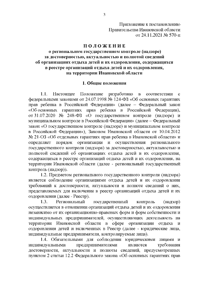 Постановление Правительства Ивановской области от 24.11.2021 N 570-п "Об утверждении Положения о региональном государственном контроле (надзоре) за достоверностью, актуальностью и полнотой сведений об организациях отдыха детей и их оздоровления, содержащихся в реестре организаций отдыха детей и их оздоровления, на территории Ивановской области"