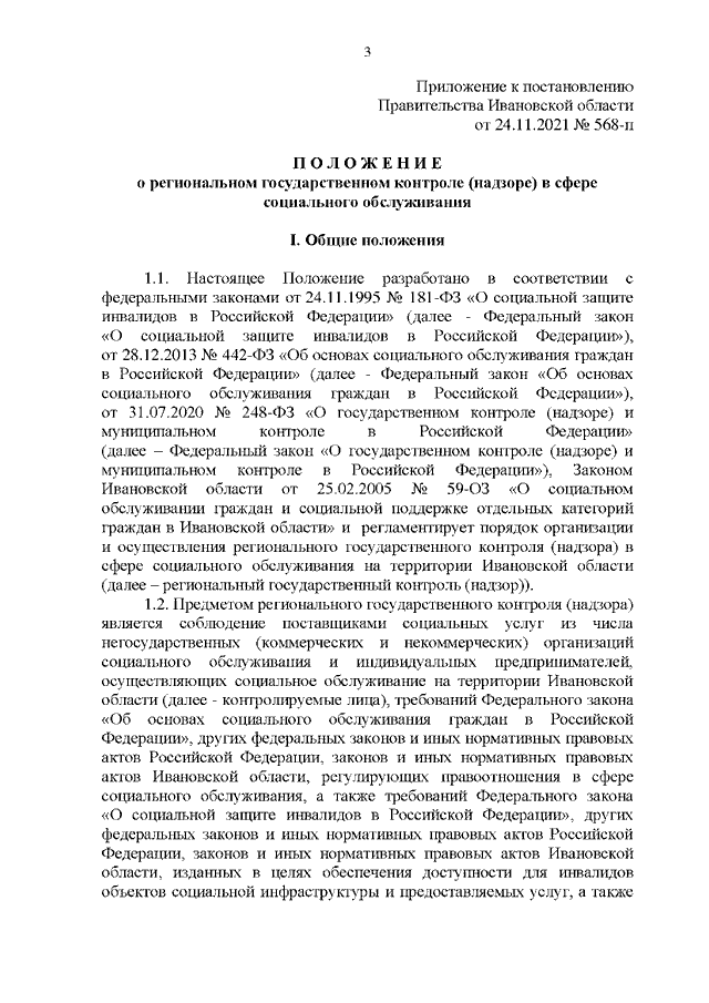 Постановление Правительства Ивановской области от 24.11.2021 N 568-п "Об утверждении Положения о региональном государственном контроле (надзоре) в сфере социального обслуживания и признании утратившими силу некоторых постановлений Правительства Ивановской области"
