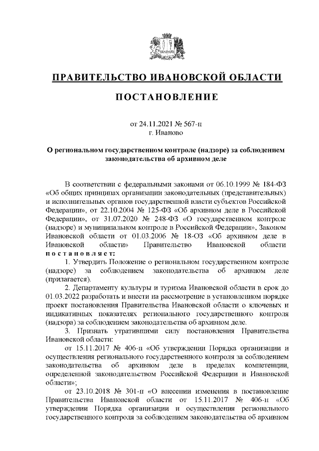 Постановление Правительства Ивановской области от 24.11.2021 N 567-п "О региональном государственном контроле (надзоре) за соблюдением законодательства об архивном деле" (вместе с "Положением о региональном государственном контроле (надзоре) за соблюдением законодательства об архивном деле")
