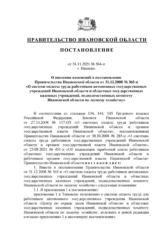 Постановление Правительства Ивановской области от 24.11.2021 N 564-п "О внесении изменений в постановление Правительства Ивановской области от 31.12.2008 N 365-п "О системе оплаты труда работников автономных государственных учреждений Ивановской области и областных государственных казенных учреждений, подведомственных комитету Ивановской области по лесному хозяйству"