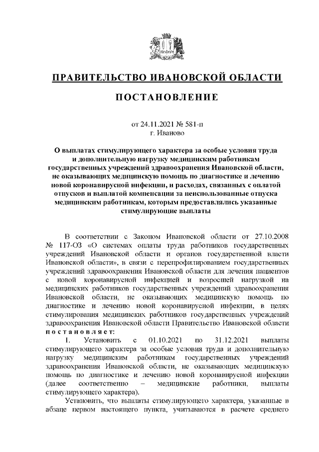 Постановление Правительства Ивановской области от 24.11.2021 N 581-п "О выплатах стимулирующего характера за особые условия труда и дополнительную нагрузку медицинским работникам государственных учреждений здравоохранения Ивановской области, не оказывающих медицинскую помощь по диагностике и лечению новой коронавирусной инфекции, и расходах, связанных с оплатой отпусков и выплатой компенсации за неиспользованные отпуска медицинским работникам, которым предоставлялись указанные стимулирующие выплаты" (вместе с "Порядком предоставления выплат стимулирующего характера за особые условия труда и дополнительную нагрузку медицинским работникам государственных учреждений здравоохранения Ивановской области, не оказывающих медицинскую помощь по диагностике и лечению новой коронавирусной инфекции")