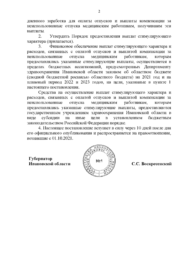 Постановление Правительства Ивановской области от 24.11.2021 N 581-п "О выплатах стимулирующего характера за особые условия труда и дополнительную нагрузку медицинским работникам государственных учреждений здравоохранения Ивановской области, не оказывающих медицинскую помощь по диагностике и лечению новой коронавирусной инфекции, и расходах, связанных с оплатой отпусков и выплатой компенсации за неиспользованные отпуска медицинским работникам, которым предоставлялись указанные стимулирующие выплаты" (вместе с "Порядком предоставления выплат стимулирующего характера за особые условия труда и дополнительную нагрузку медицинским работникам государственных учреждений здравоохранения Ивановской области, не оказывающих медицинскую помощь по диагностике и лечению новой коронавирусной инфекции")