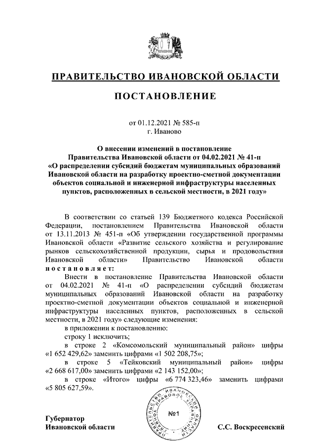 Постановление Правительства Ивановской области от 01.12.2021 N 585-п "О внесении изменений в постановление Правительства Ивановской области от 04.02.2021 N 41-п "О распределении субсидий бюджетам муниципальных образований Ивановской области на разработку проектно-сметной документации объектов социальной и инженерной инфраструктуры населенных пунктов, расположенных в сельской местности, в 2021 году"