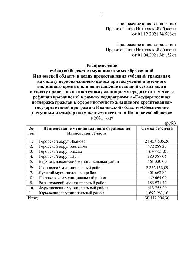 Постановление Правительства Ивановской области от 01.12.2021 N 588-п "О внесении изменения в постановление Правительства Ивановской области от 01.04.2021 N 152-п "О распределении субсидий бюджетам муниципальных образований Ивановской области в целях предоставления субсидий гражданам на оплату первоначального взноса при получении ипотечного жилищного кредита или на погашение основной суммы долга и уплату процентов по ипотечному жилищному кредиту (в том числе рефинансированному) в рамках подпрограммы "Государственная поддержка граждан в сфере ипотечного жилищного кредитования" государственной программы Ивановской области "Обеспечение доступным и комфортным жильем населения Ивановской области" в 2021 году"