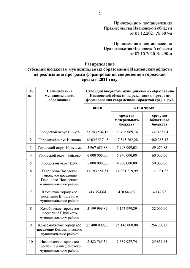 Постановление Правительства Ивановской области от 01.12.2021 N 587-п "О внесении изменения в постановление Правительства Ивановской области от 07.10.2020 N 490-п "О распределении субсидий бюджетам муниципальных образований на реализацию программ формирования современной городской среды в 2021 году"