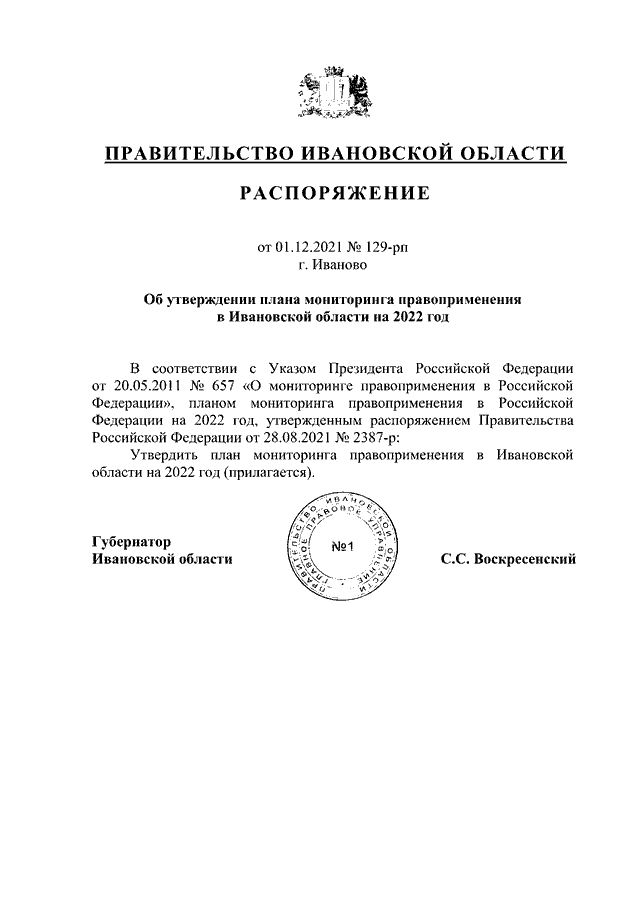 Распоряжение Правительства Ивановской области от 01.12.2021 N 129-рп "Об утверждении плана мониторинга правоприменения в Ивановской области на 2022 год"
