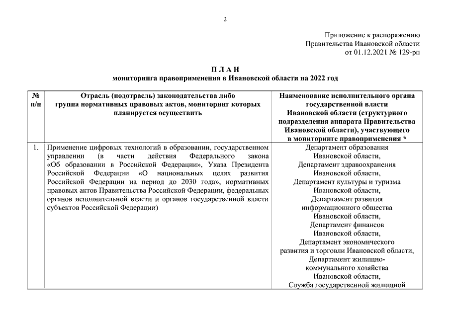 Распоряжение Правительства Ивановской области от 01.12.2021 N 129-рп "Об утверждении плана мониторинга правоприменения в Ивановской области на 2022 год"
