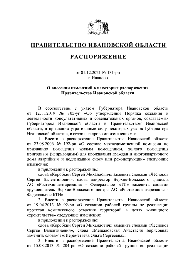 Распоряжение Правительства Ивановской области от 01.12.2021 N 131-рп "О внесении изменений в некоторые распоряжения Правительства Ивановской области"