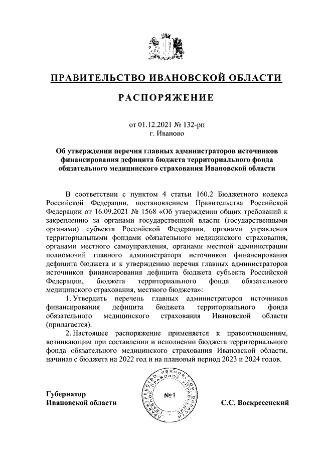 Распоряжение Правительства Ивановской области от 01.12.2021 N 132-рп "Об утверждении перечня главных администраторов источников финансирования дефицита бюджета территориального фонда обязательного медицинского страхования Ивановской области"
