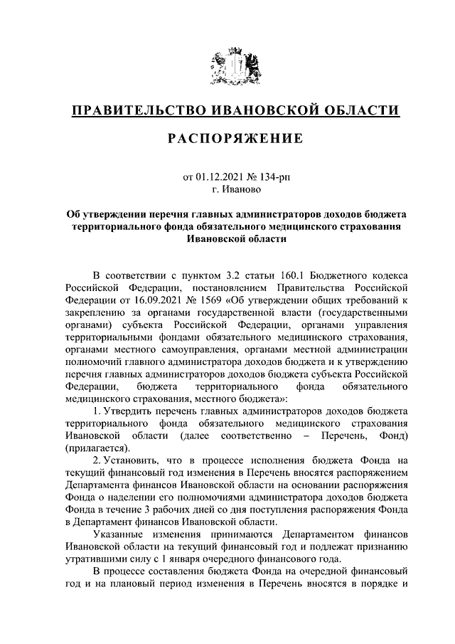 Распоряжение Правительства Ивановской области от 01.12.2021 N 134-рп "Об утверждении перечня главных администраторов доходов бюджета территориального фонда обязательного медицинского страхования Ивановской области"