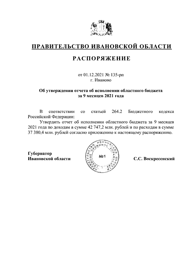 Распоряжение Правительства Ивановской области от 01.12.2021 N 135-рп "Об утверждении отчета об исполнении областного бюджета за 9 месяцев 2021 года"