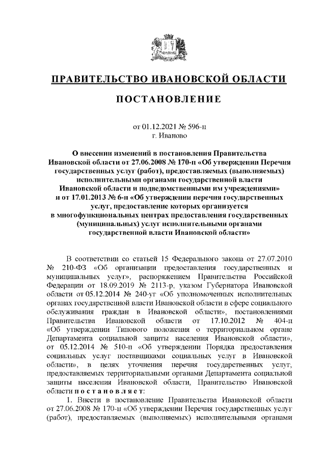 Постановление Правительства Ивановской области от 01.12.2021 N 596-п "О внесении изменений в постановления Правительства Ивановской области от 27.06.2008 N 170-п "Об утверждении Перечня государственных услуг (работ), предоставляемых (выполняемых) исполнительными органами государственной власти Ивановской области и подведомственными им учреждениями" и от 17.01.2013 N 6-п "Об утверждении перечня государственных услуг, предоставление которых организуется в многофункциональных центрах предоставления государственных (муниципальных) услуг исполнительными органами государственной власти Ивановской области"
