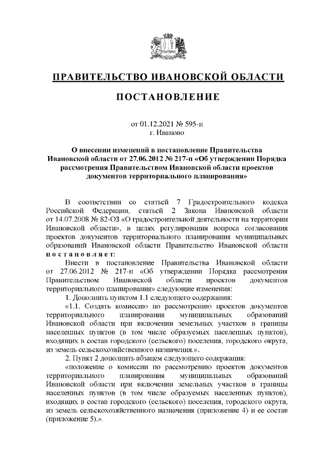 Постановление Правительства Ивановской области от 01.12.2021 N 595-п "О внесении изменений в постановление Правительства Ивановской области от 27.06.2012 N 217-п "Об утверждении Порядка рассмотрения Правительством Ивановской области проектов документов территориального планирования" (вместе с "Положением о комиссии по рассмотрению проектов документов территориального планирования муниципальных образований Ивановской области при включении земельных участков в границы населенных пунктов (в том числе образуемых населенных пунктов), входящих в состав городского (сельского) поселения, городского округа, из земель сельскохозяйственного назначения")