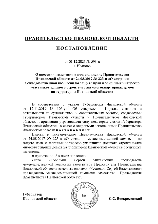 Постановление Правительства Ивановской области от 01.12.2021 N 593-п "О внесении изменения в постановление Правительства Ивановской области от 24.08.2017 N 323-п "О создании межведомственной комиссии по защите прав и законных интересов участников долевого строительства многоквартирных домов на территории Ивановской области"