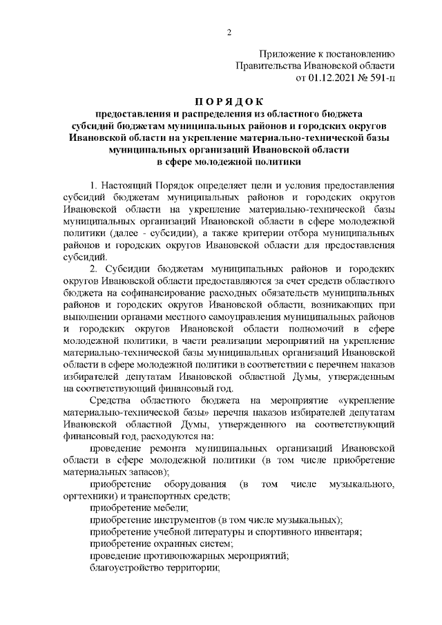 Постановление Правительства Ивановской области от 01.12.2021 N 591-п "Об утверждении Порядка предоставления и распределения из областного бюджета субсидий бюджетам муниципальных районов и городских округов Ивановской области на укрепление материально-технической базы муниципальных организаций Ивановской области в сфере молодежной политики"