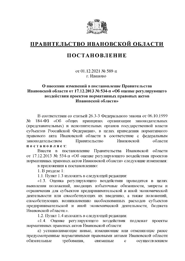Постановление Правительства Ивановской области от 01.12.2021 N 589-п "О внесении изменений в постановление Правительства Ивановской области от 17.12.2013 N 534-п "Об оценке регулирующего воздействия проектов нормативных правовых актов Ивановской области"
