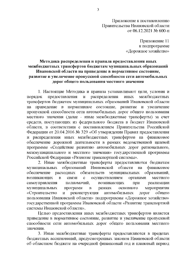 Постановление Правительства Ивановской области от 06.12.2021 N 600-п "О внесении изменений в постановление Правительства Ивановской области от 13.11.2013 N 447-п "Об утверждении государственной программы Ивановской области "Развитие транспортной системы Ивановской области" (вместе с "Методикой распределения и правилами предоставления иных межбюджетных трансфертов бюджетам муниципальных образований Ивановской области на приведение в нормативное состояние, развитие и увеличение пропускной способности сети автомобильных дорог общего пользования местного значения")