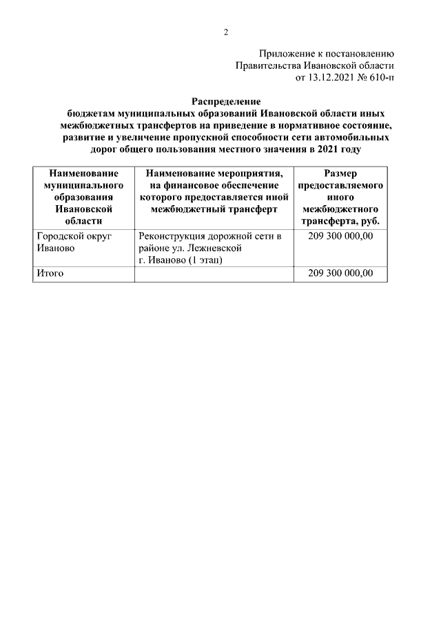 Постановление Правительства Ивановской области от 13.12.2021 N 610-п "О распределении бюджетам муниципальных образований Ивановской области иных межбюджетных трансфертов на приведение в нормативное состояние, развитие и увеличение пропускной способности сети автомобильных дорог общего пользования местного значения в 2021 году"