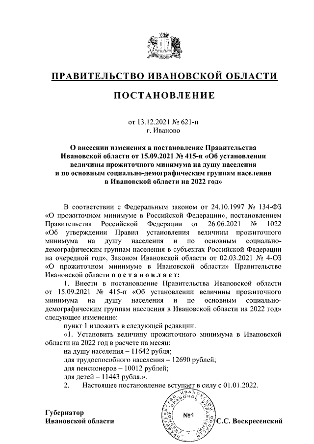 Постановление Правительства Ивановской области от 13.12.2021 N 621-п "О внесении изменения в постановление Правительства Ивановской области от 15.09.2021 N 415-п "Об установлении величины прожиточного минимума на душу населения и по основным социально-демографическим группам населения в Ивановской области на 2022 год"