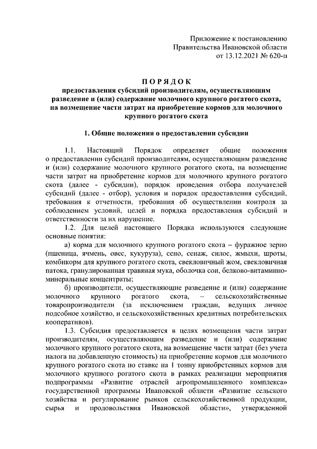Постановление Правительства Ивановской области от 13.12.2021 N 620-п "Об утверждении Порядка предоставления субсидий производителям, осуществляющим разведение и (или) содержание молочного крупного рогатого скота, на возмещение части затрат на приобретение кормов для молочного крупного рогатого скота"