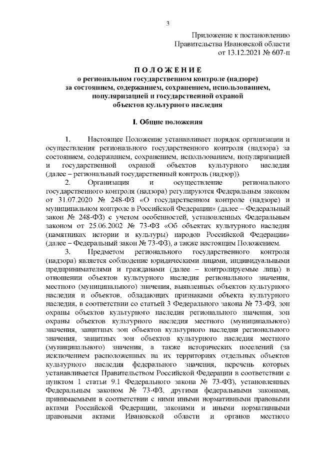 Постановление Правительства Ивановской области от 13.12.2021 N 607-п "О региональном государственном контроле (надзоре) за состоянием, содержанием, сохранением, использованием, популяризацией и государственной охраной объектов культурного наследия" (вместе с "Положением о региональном государственном контроле (надзоре) за состоянием, содержанием, сохранением, использованием, популяризацией и государственной охраной объектов культурного наследия")
