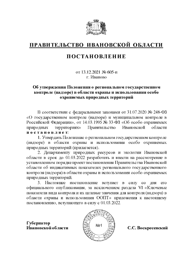 Постановление Правительства Ивановской области от 13.12.2021 N 605-п "Об утверждении Положения о региональном государственном контроле (надзоре) в области охраны и использования особо охраняемых природных территорий"